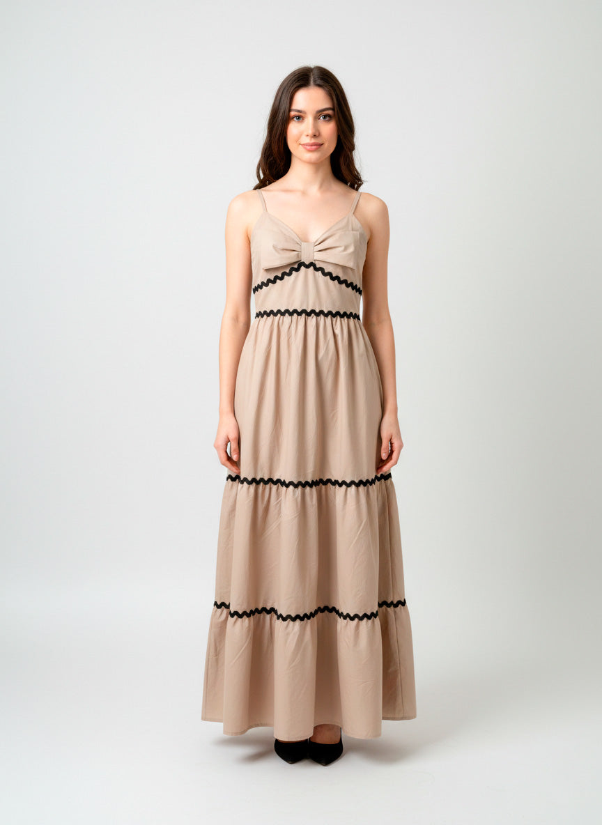 Vestido Largo Abril Beige con Ribete Ondulado y Lazo Frontal