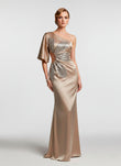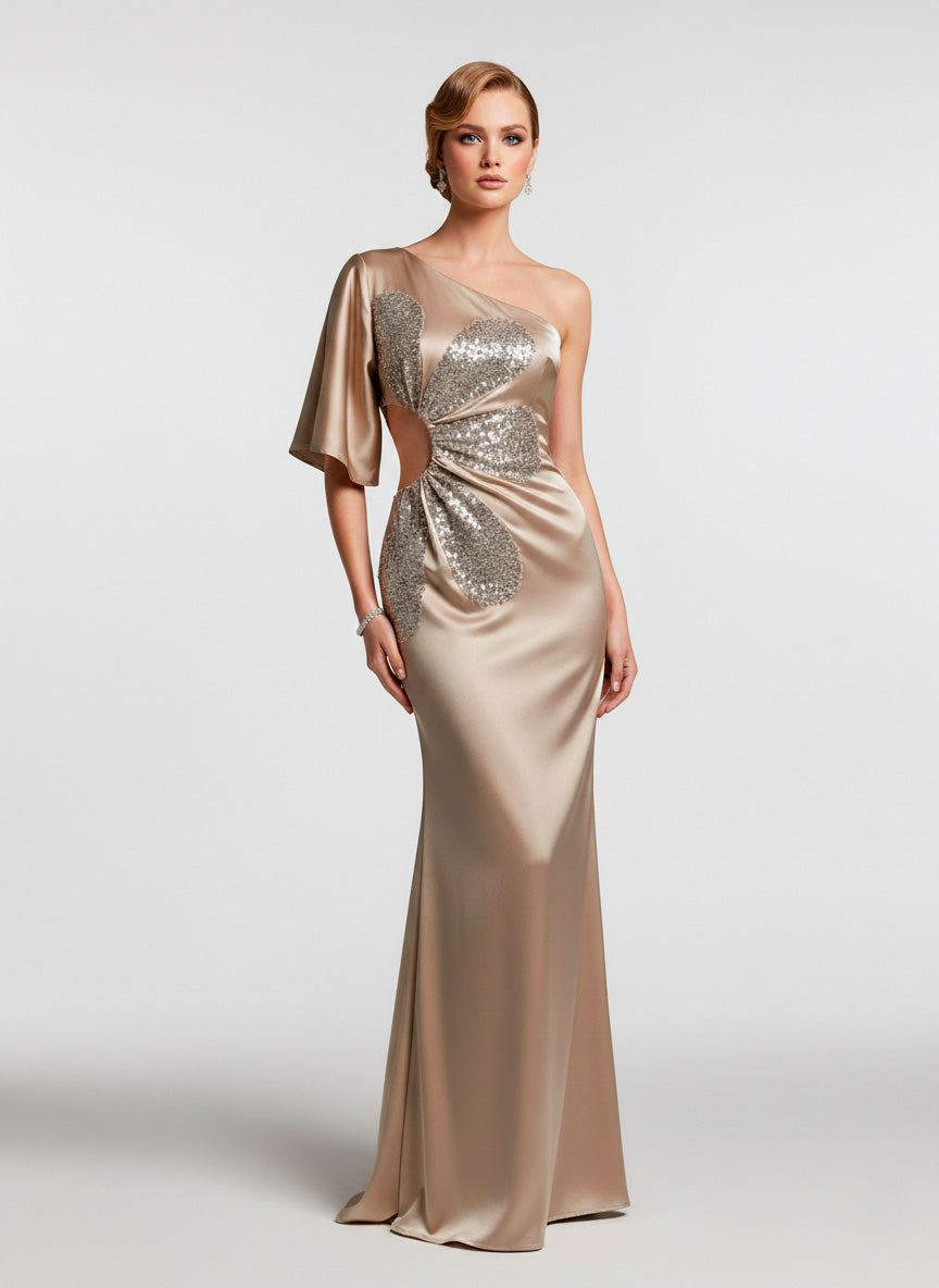 Vestido de Gala Agata Satín de un Solo Hombro con Detalle de Lentejuelas
